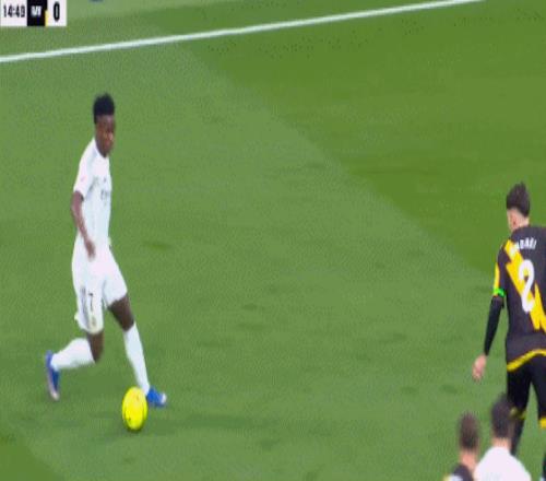 比赛刚刚开打10分钟,皇马就遭遇重创,中场核心贝林厄姆在没有对抗的情况下受伤,随后泪洒现场,阿韦洛亚只能用迪亚斯将其换下,不过3分钟之后,皇马就打破了场上的平衡,维尼修斯左路一挑三,连续晃动创造出起脚空间后,直接兜射建功,打破了长达13轮的西甲进球荒,帮助皇马取得了1-0的领先。