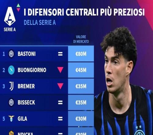 北京时间12月24日,在更新了意甲球员的身价之后,德转列出了目前意甲身价最高的10名中后卫,巴斯托尼8000万欧元断