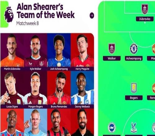 北京时间10月21日,英超官方晒出了阿兰-希勒评选的英超第8轮最佳阵容,其中哈兰德、B费、马奎尔、阿昌庞在列,教